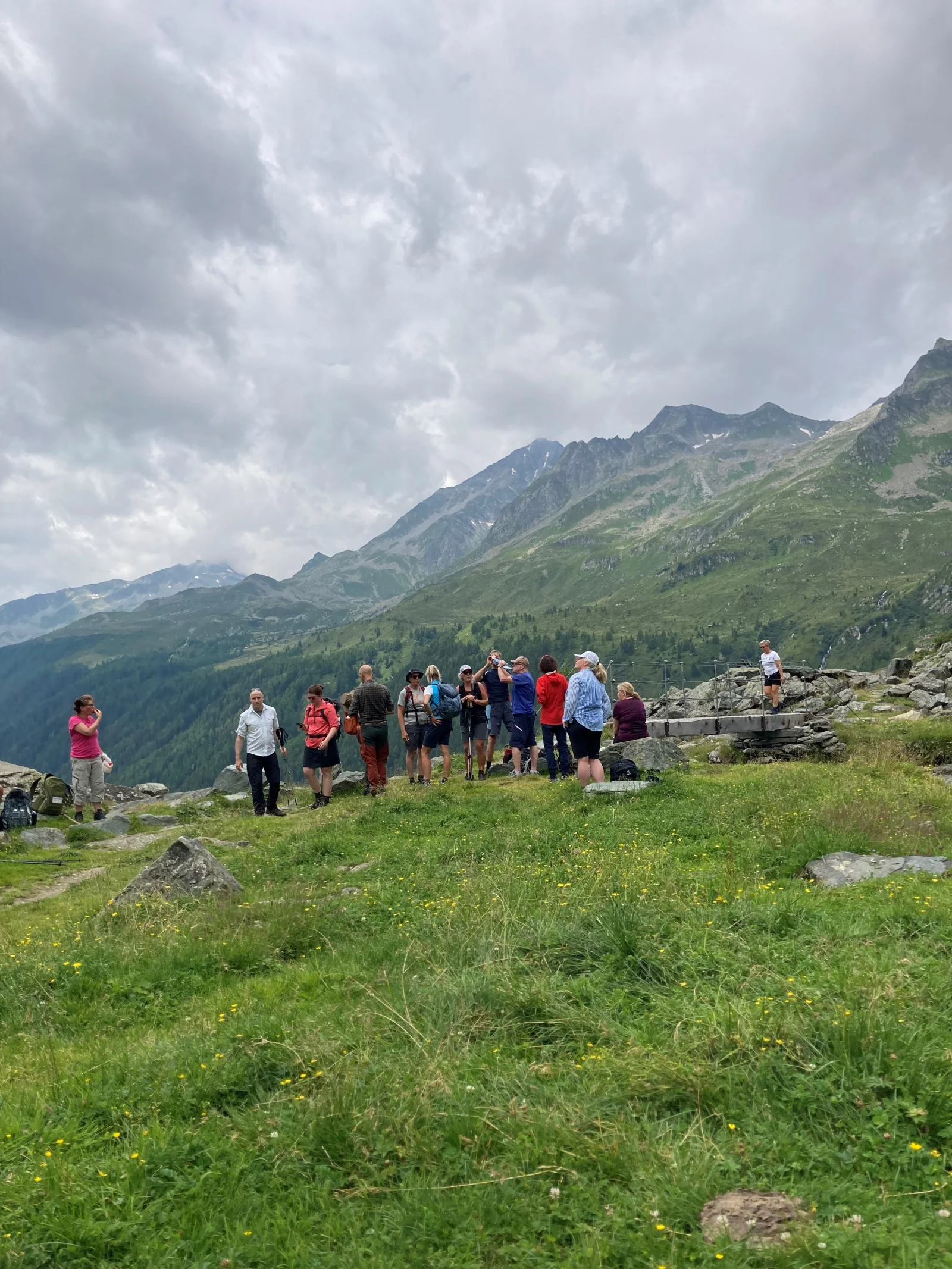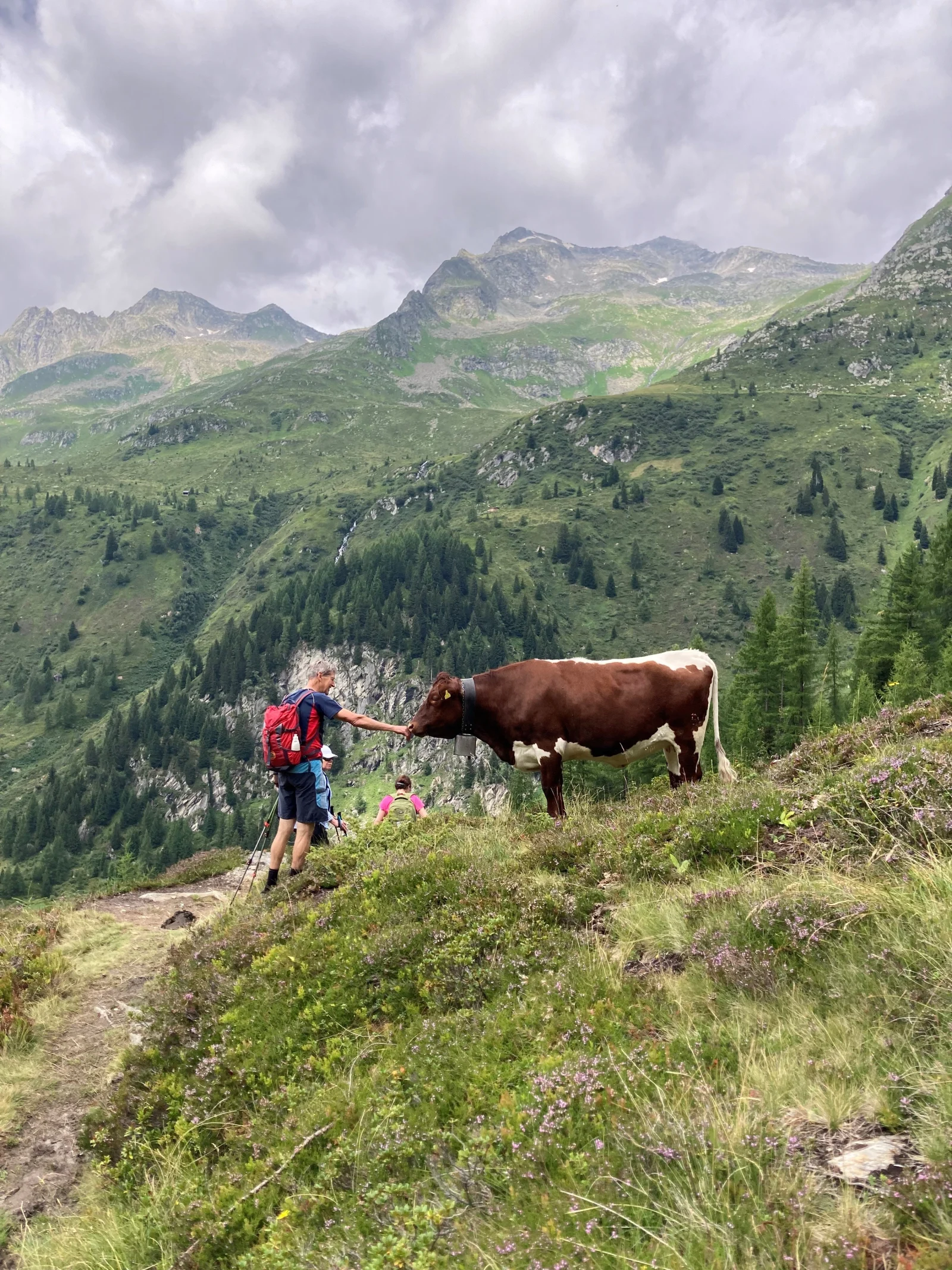 Murmeldjur försvann lika snabbt som de dök upp ur sina hålor, medan sällskapliga kor korsade vår väg. På marken letade vi efter sällsynta alpblommor som den vita Edelweissen, rosa Alprosen och den gula Slåttergubben (Arnica). Det kändes som att vandra genom en levande tavla, där de snöklädda bergstopparna i horisonten ramade in vår väg uppåt.