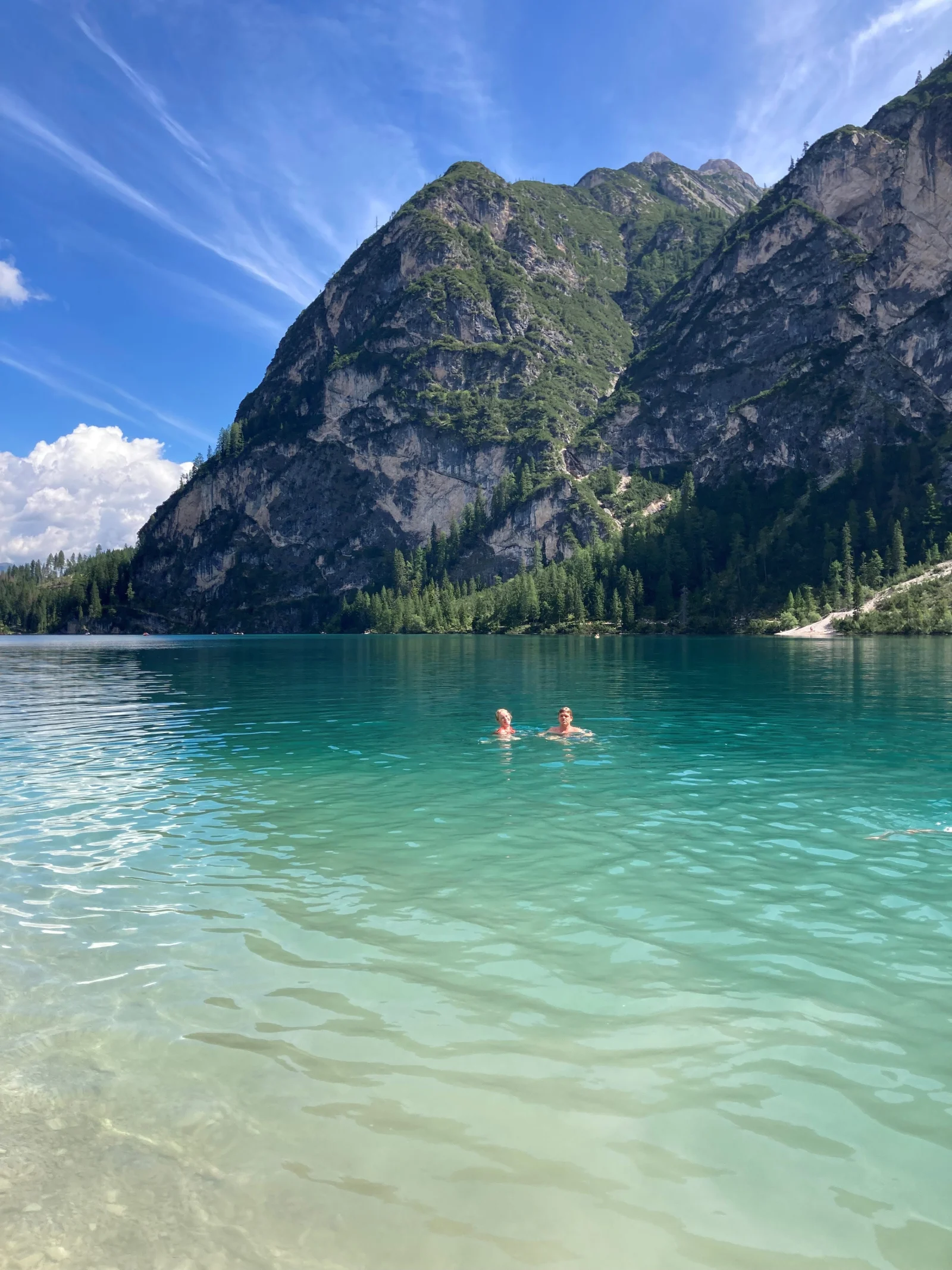 Vår reseledare berättade senare under vår vandring runt sjön att Pragser Wildsee aldrig blir varmare än 16 grader. Kalla ord, men ändå inget som hindrade oss svenskar från ett bad. Efter att nästan ha tagit oss ett helt varv runt sjön kastade vi oss i det kyliga vattnet. Solen stod idag högt på himlen, och endast några få moln täckte dess strålar från att nå våra svettiga ansikten, vilket gjorde det kalla doppet desto mer uppfriskande.