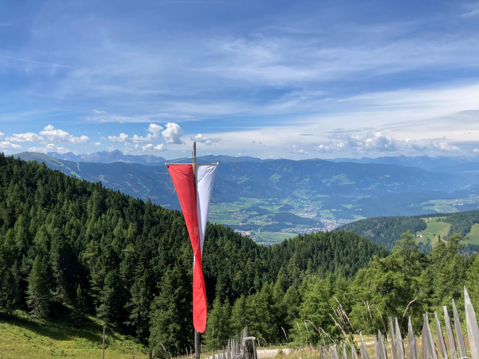 En av resans första vandringar tog oss till bergsmassivet Speikboden. Vi började med att ta en gondollift upp till bergens mittpunkt, där vi klev av för att sedan fortsätta resan med ytterligare en lift – denna gång nästan hela vägen upp till toppen.Om liftturen bjöd på vackra vykortsvyer, var det ingenting mot den skönhet som mötte oss uppe på bergskammen. Här kunde vi blicka ut över de österrikiska Alperna i norr och de italienska Dolomiterna i söder. I väst och öst möttes våra blickar av allt från små lantliga alpbyar, lummiga skogsdungar, blomstrande alpängar och betande boskap.